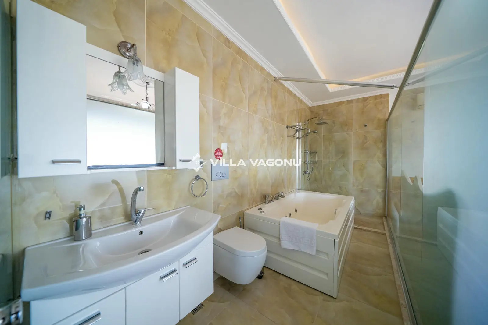 Kapasiteye uygun oturma grubu ve Amerikan tarzda mutfağında günlük ihtiyaç duyabileceğiniz beyaz eşya ve araç-gereçler mevcuttur. Yedi yatak odasında da özel banyo/wc bulunan villamızın ebeveyn yatak odalarından birinde jakuzisi bulunmaktadır. Korunaklı havuz terasında şezlonglarda ve oturma alanında güneşin keyfini çıkarabilir, bilardo vemasa tenisiyle eğlenceli bir tatil geçirebilirsiniz. Ayrıca villamızda çocuklar için su kaydırağı da bulunmaktadır.