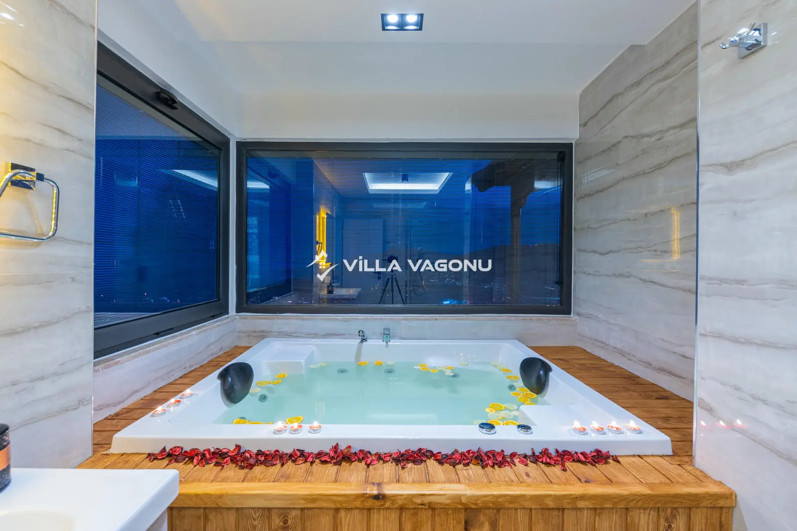 Villamızın özel havuzunda doyasıya yüzebilir ve güneşin keyfini çıkarabilirsiniz. Bahçe alanında kapasiteye uygun şezlong takımı, oturma grubu ve barbekü bulunmaktadır. Havuz terasına açılan konforlu oturma odası ve tam donanımlı açık mutfak, tatilinizi daha da keyifli hale getirecek. Villamızın birinci yatak odasında çift kişilik yatak, ebeveyn banyosu ve jakuzi; ikinci yatak odasında bir adet çift kişilik yatak ve banyo; üçüncü yatak odasında ise iki adet tek kişilik yatak ve banyo yer almaktadır.