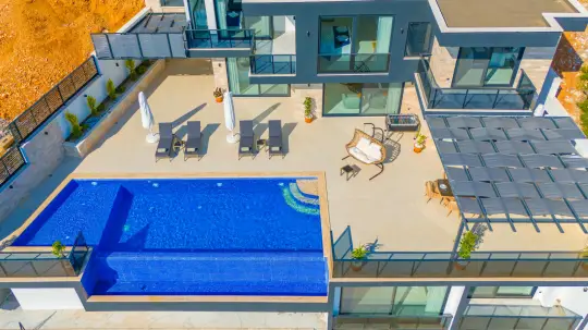 Muhteşem manzaraya karşı, güneşlenip yüzebileceğiniz havuz terasında kapasiteye uygun şezlong takımı, oturma grubu ve barbekü alanı bulunan villanın, yine havuz terasına açılan konforlu oturma odası ve tam donanımlı açık mutfağı; 3 adet yatak odasında çift kişilik yatak ebeveyn banyosu; 2 adet yatak odasında iki tek kişilik yatak ve banyo bulunmaktadır. Villamızın yatak odalarından iki tanesinde bulunan jakuziler sayesinde yılın tüm yorgunluğunu üzerinizden atabilirsiniz. Ayrıca villamızın ortak kullanım alanlarında hamam ve bilardo da bulunmaktadır.