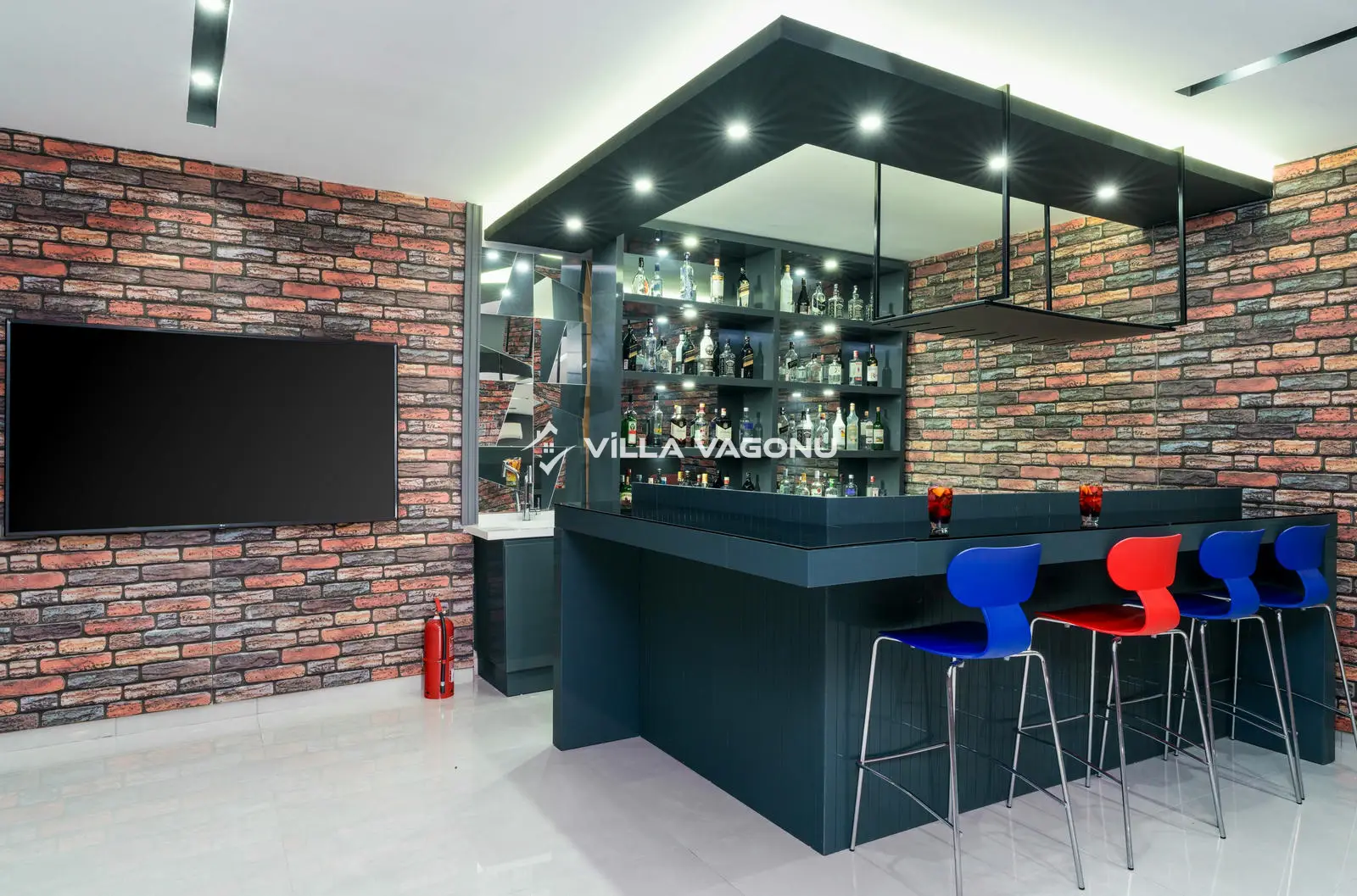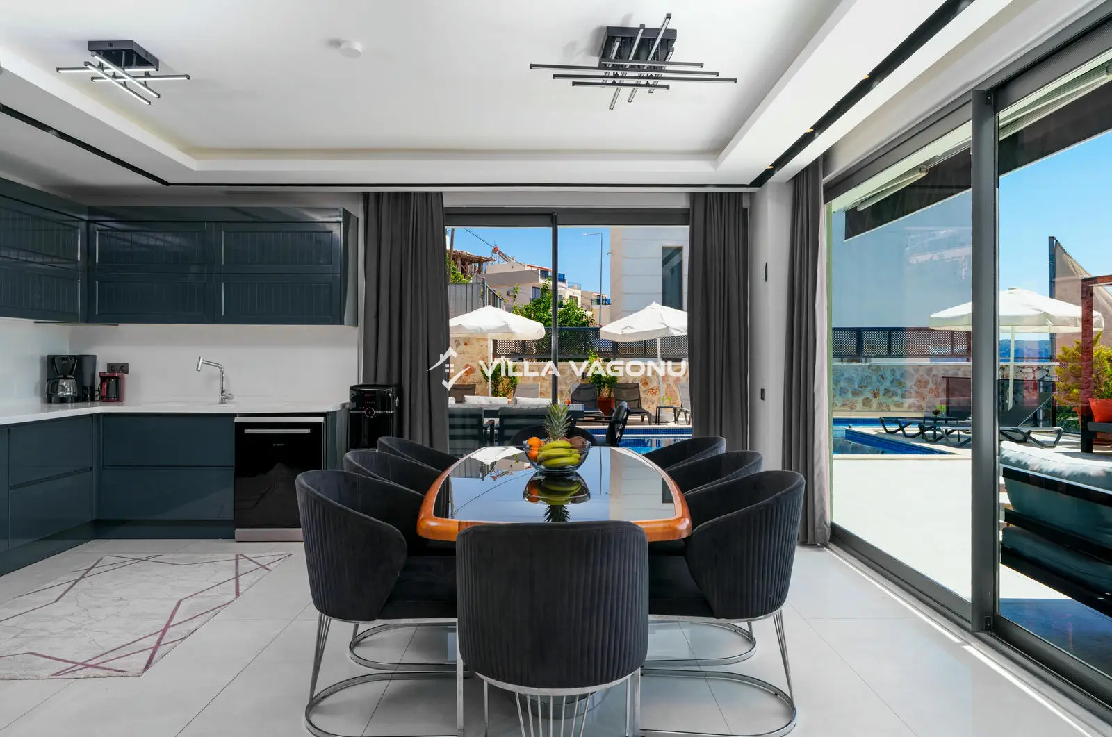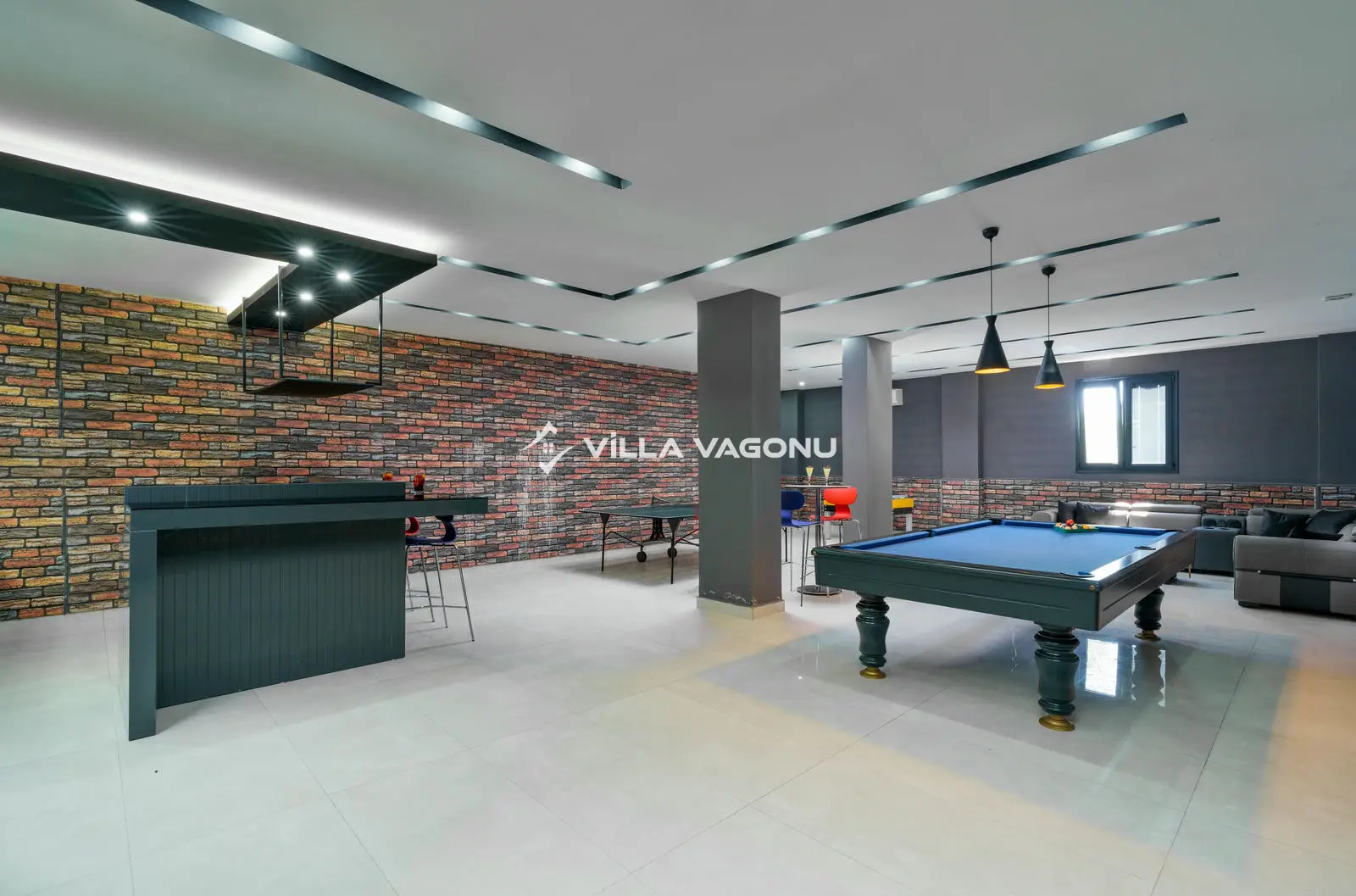 Villamız bünyesinde bulunan spor kompleksi, kapalı havuzu, saunası, 2 adet jakuzisi ve her yatak odasında bulunan banyo ve WC'si ile kalabalık ailelere ve arkadaş gruplarına konforlu bir tatil imkanı sunuyor. Villamız oturma odasında kapasiteye uygun mobilyalar ve Amerikan tarzda mutfağında ihtiyacınız olacak tüm araç- gereçler mevcuttur. Müstakil bahçesi ve özel havuz alanında güneşin keyfini çıkaracağınız şezlong takımları ve çocuklar için de bir havuz bulumaktadır.