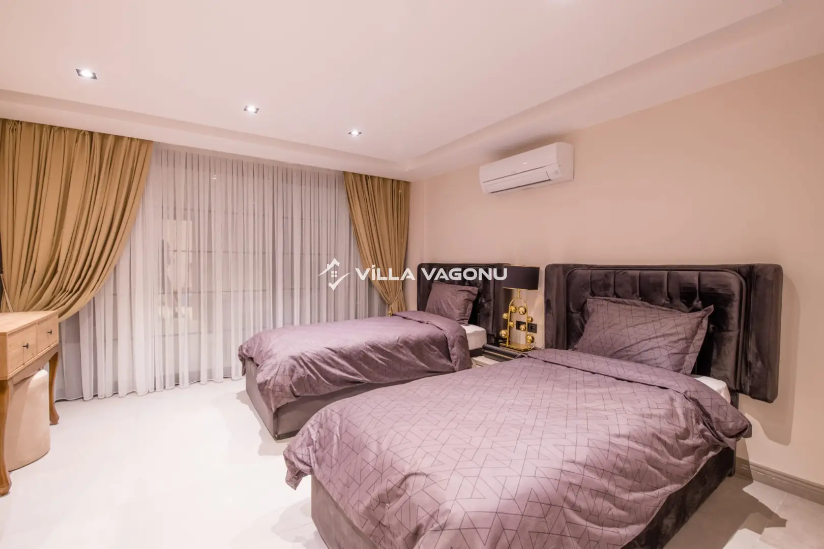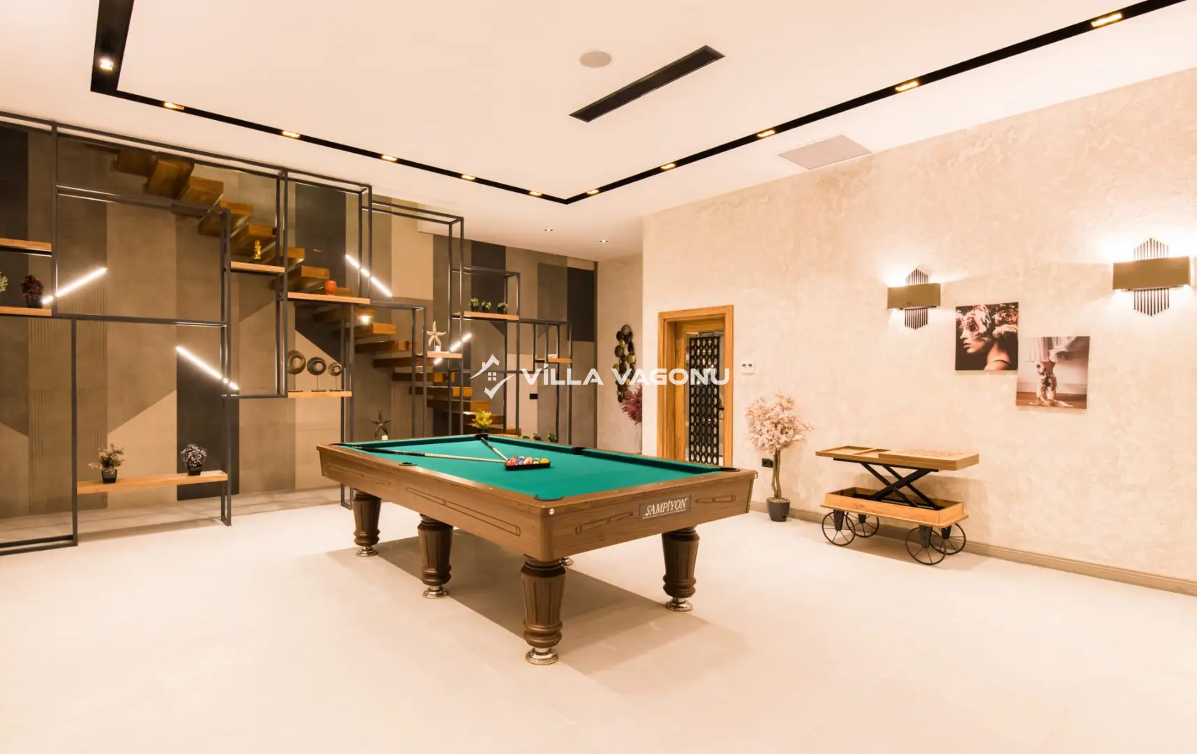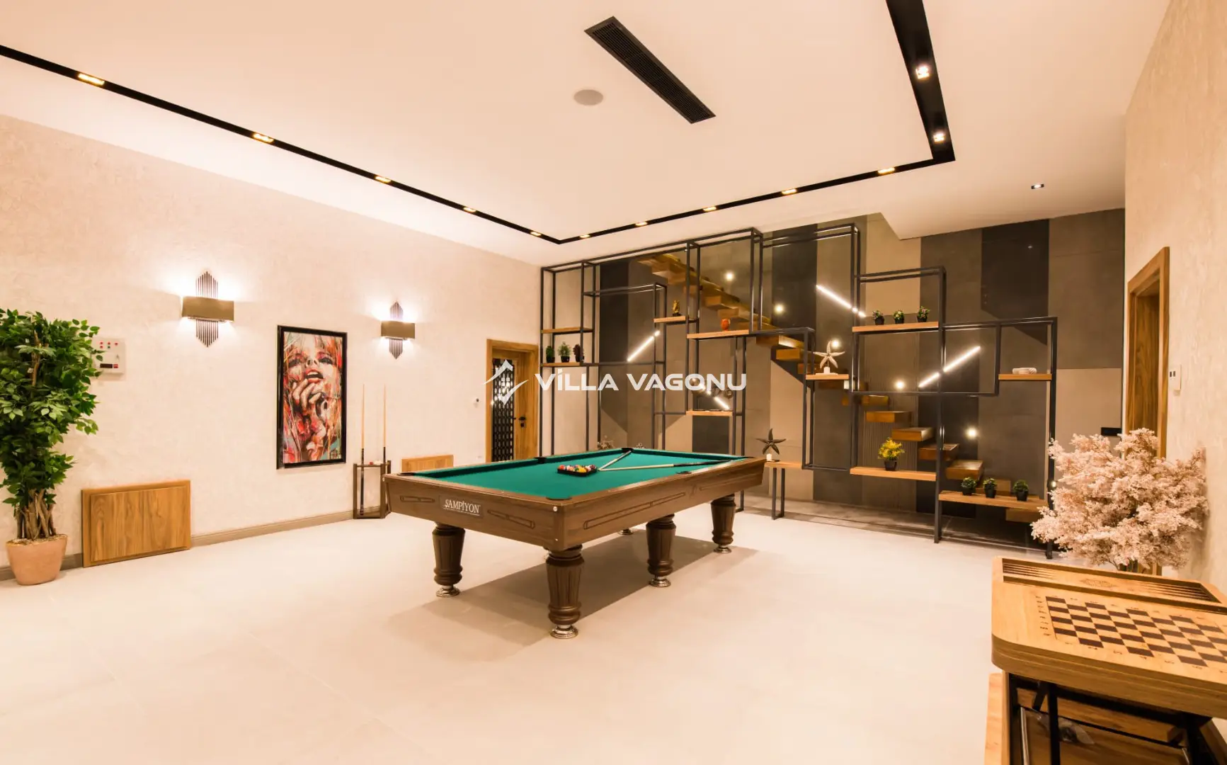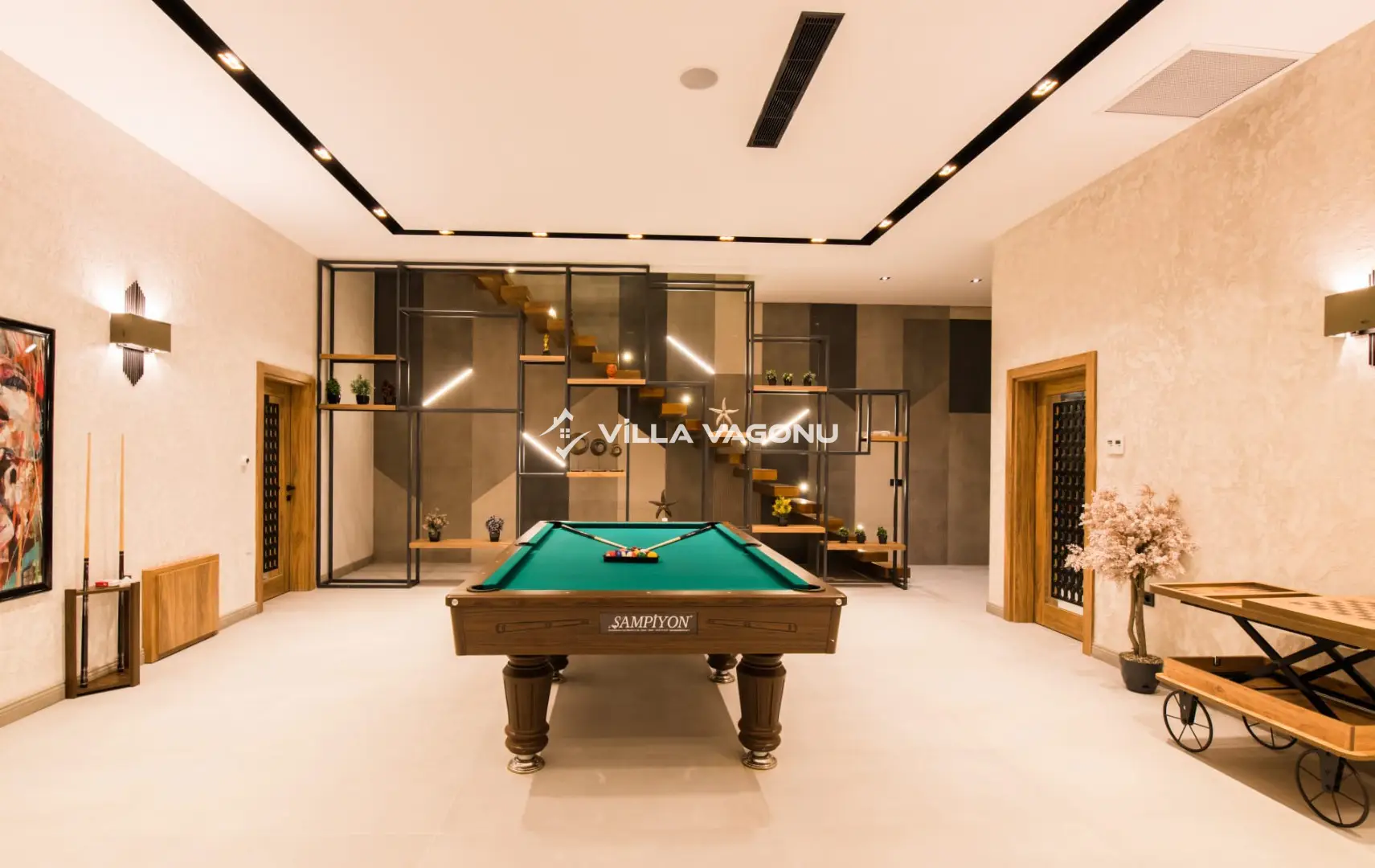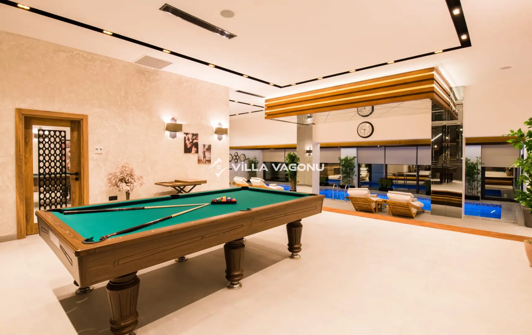 Villamızın özel havuzunda doyasıya yüzebilir ve güneşin keyfini çıkarabilirsiniz. Bahçe alanında kapasiteye uygun şezlong takımı, oturma grubu ve barbekü bulunmaktadır. Havuz terasına açılan konforlu oturma odası ve tam donanımlı açık mutfak, tatilinizi daha da keyifli hale getirecek. Villamızın birinci yatak odasında çift kişilik yatak, ebeveyn banyosu ve jakuzi; ikinci yatak odasında bir adet tek çift yatak ve banyo; üçüncü yatak odasında iki adet tek kişilik yatak ve banyo; dördüncü yatak odasında ise iki adet tek kişilik yatak ve banyo yer almaktadır. Aynı zamanda lüx villamızın içersisinde keyifli bir zaman geçirebilmeniz için kapalı havuzu ve bilardo masası, bar,sauna ve spor salonu bulunmaktadır.