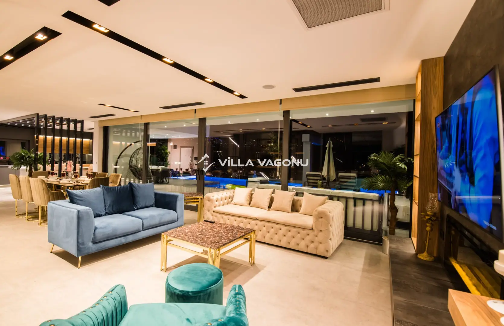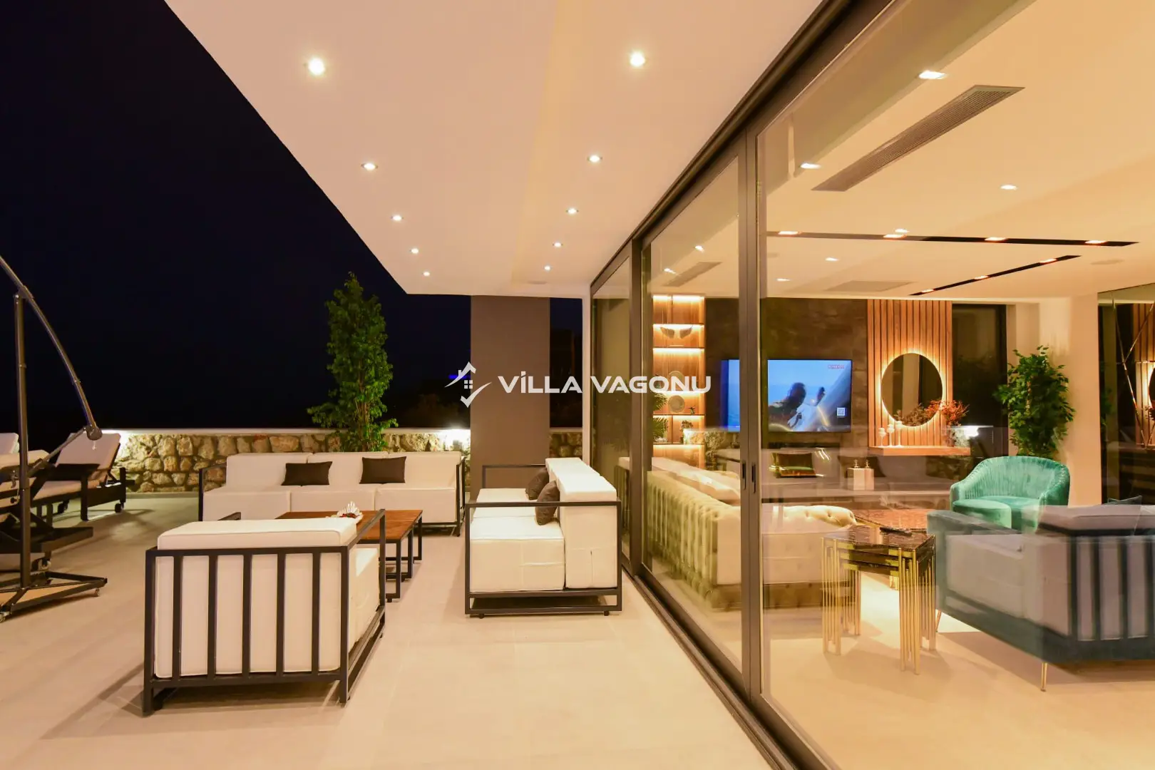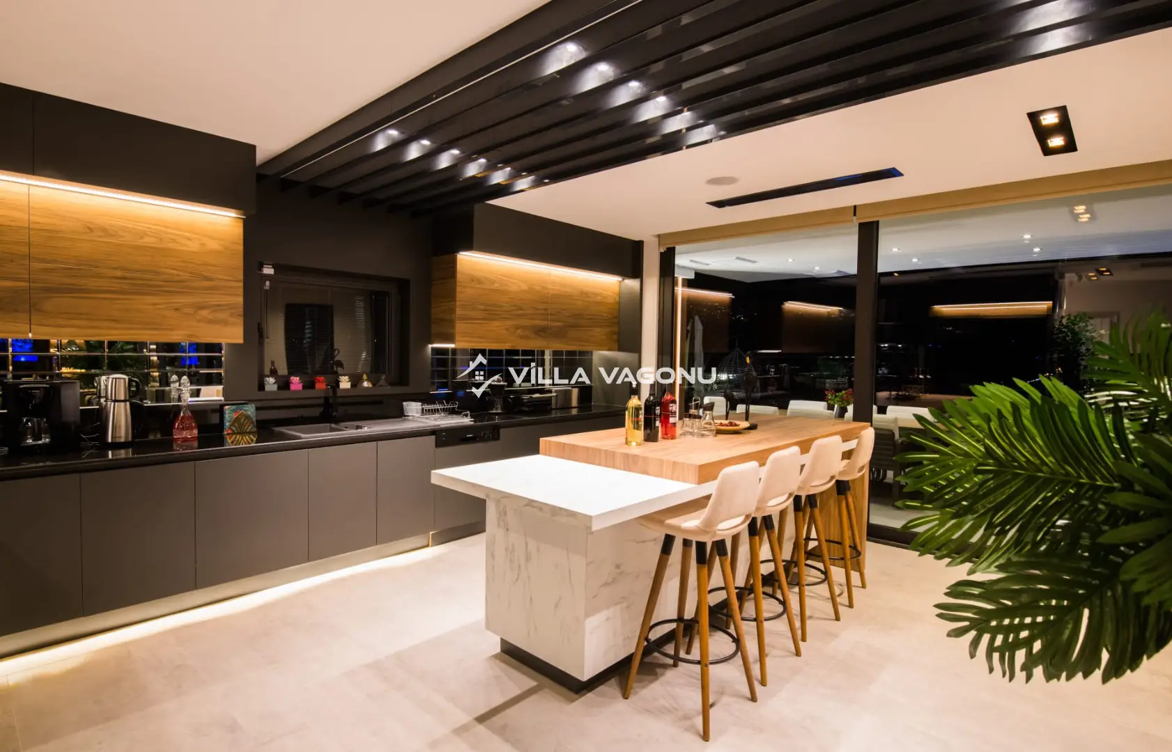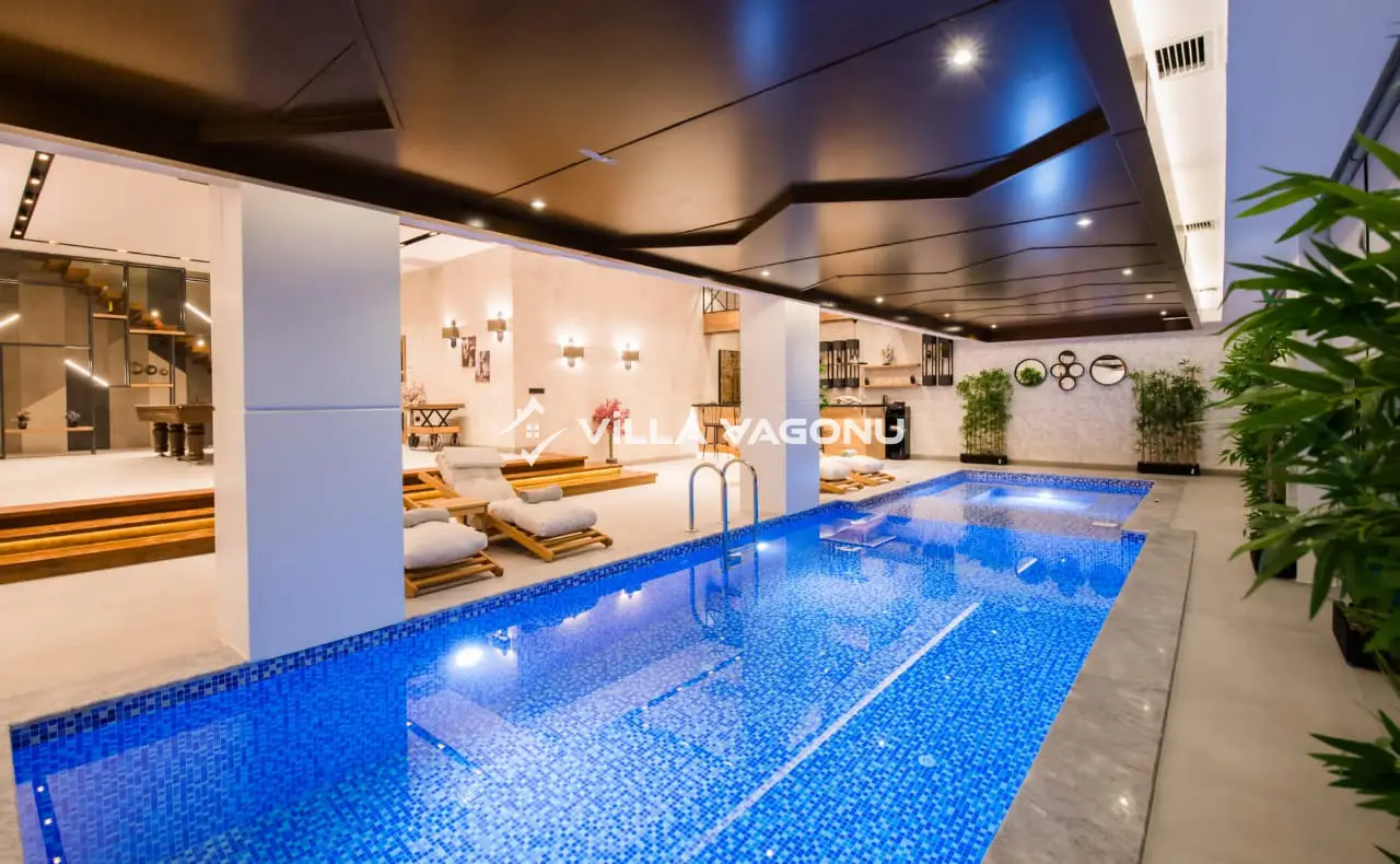 Villamızın özel havuzunda doyasıya yüzebilir ve güneşin keyfini çıkarabilirsiniz. Bahçe alanında kapasiteye uygun şezlong takımı, oturma grubu ve barbekü bulunmaktadır. Havuz terasına açılan konforlu oturma odası ve tam donanımlı açık mutfak, tatilinizi daha da keyifli hale getirecek. Villamızın birinci yatak odasında çift kişilik yatak, ebeveyn banyosu ve jakuzi; ikinci yatak odasında bir adet tek çift yatak ve banyo; üçüncü yatak odasında iki adet tek kişilik yatak ve banyo; dördüncü yatak odasında ise iki adet tek kişilik yatak ve banyo yer almaktadır. Aynı zamanda lüx villamızın içersisinde keyifli bir zaman geçirebilmeniz için kapalı havuzu ve bilardo masası, bar,sauna ve spor salonu bulunmaktadır.