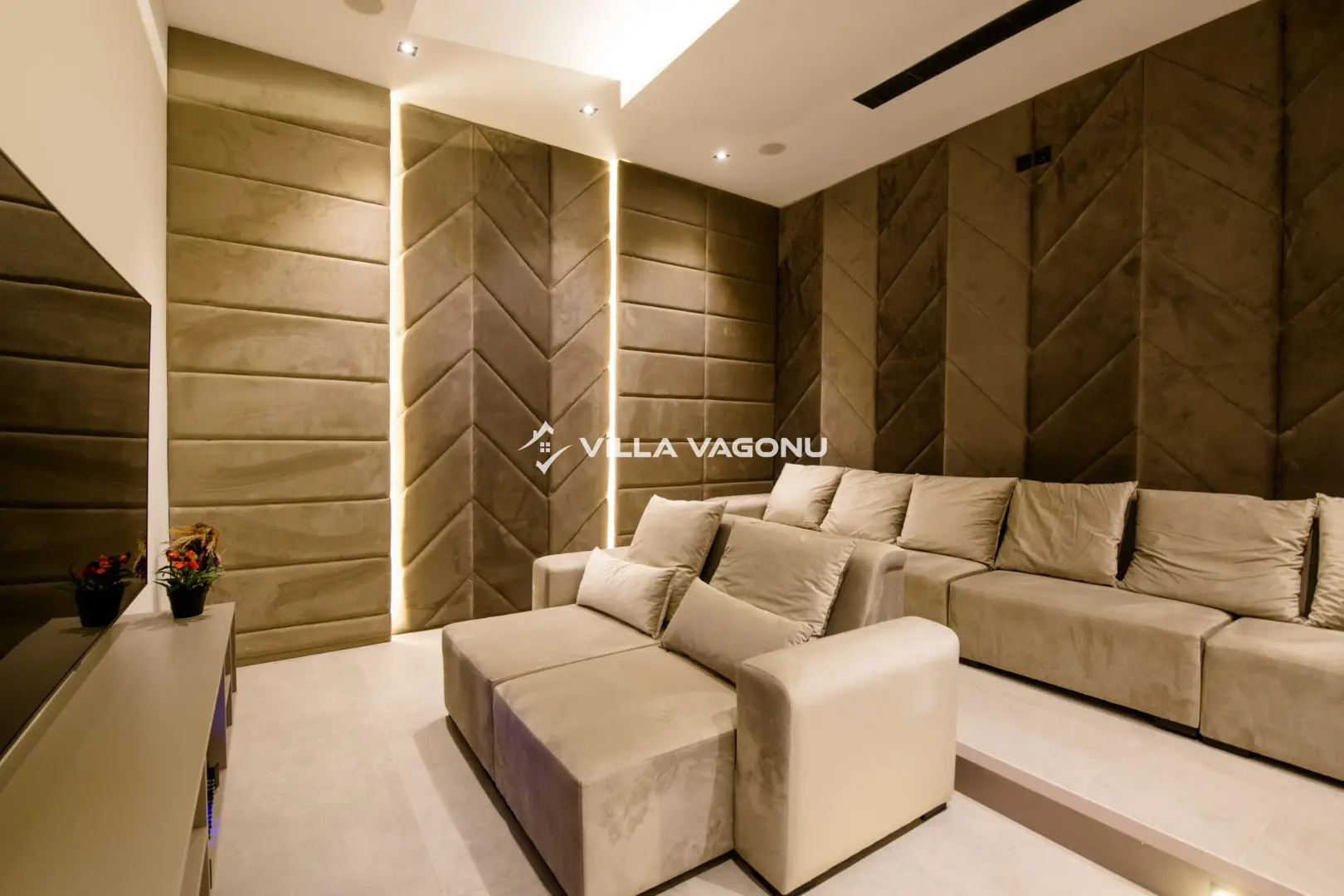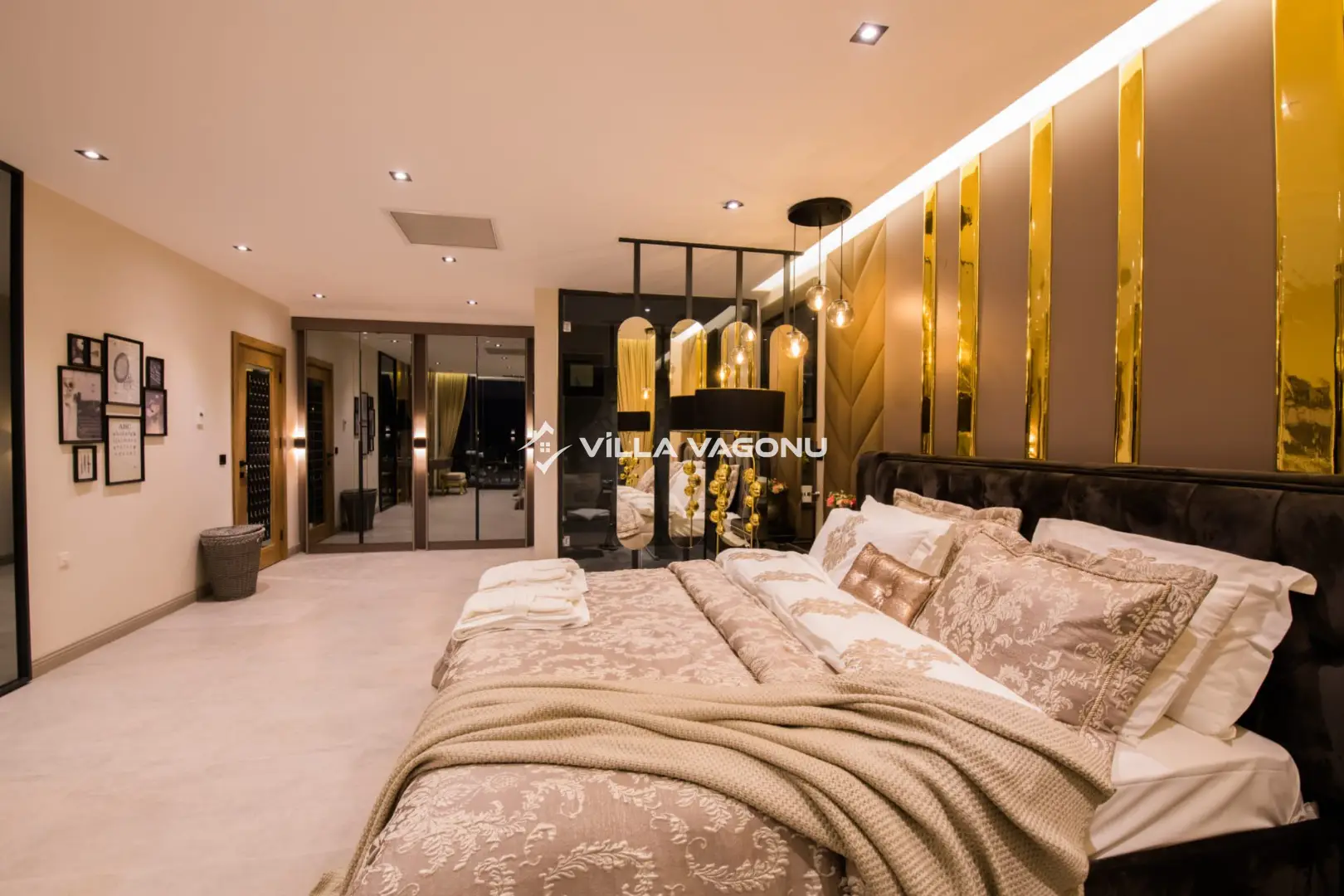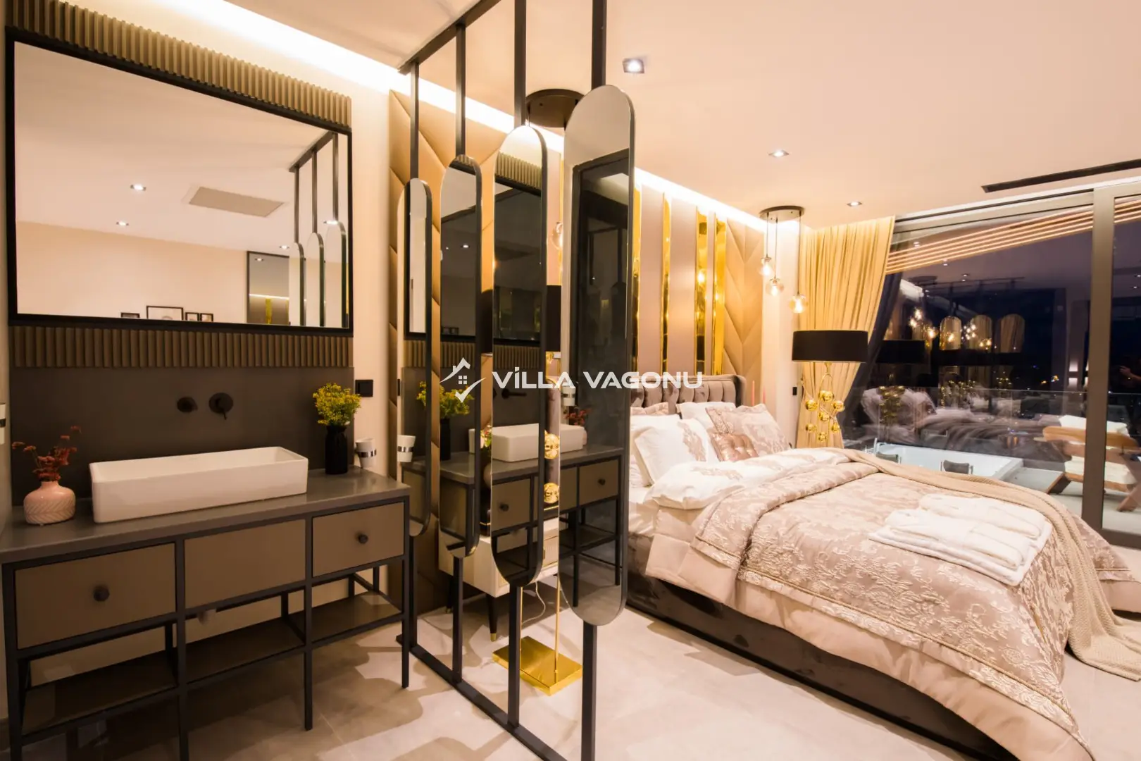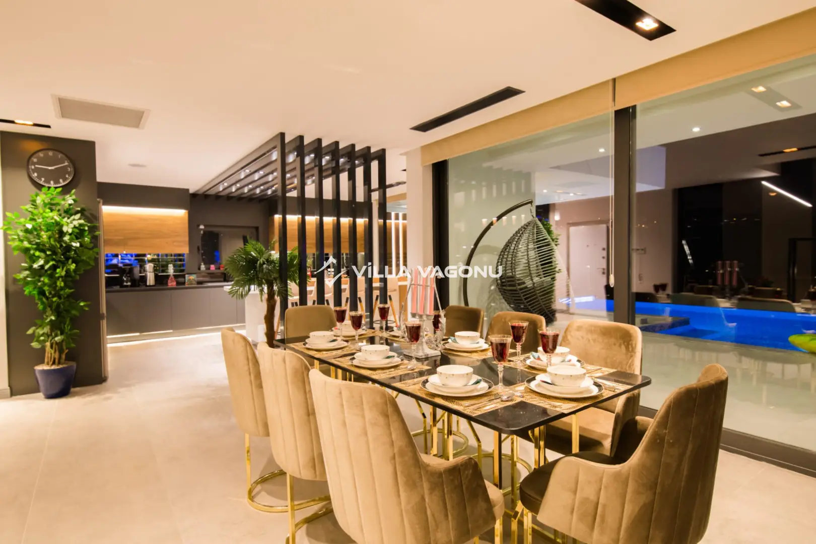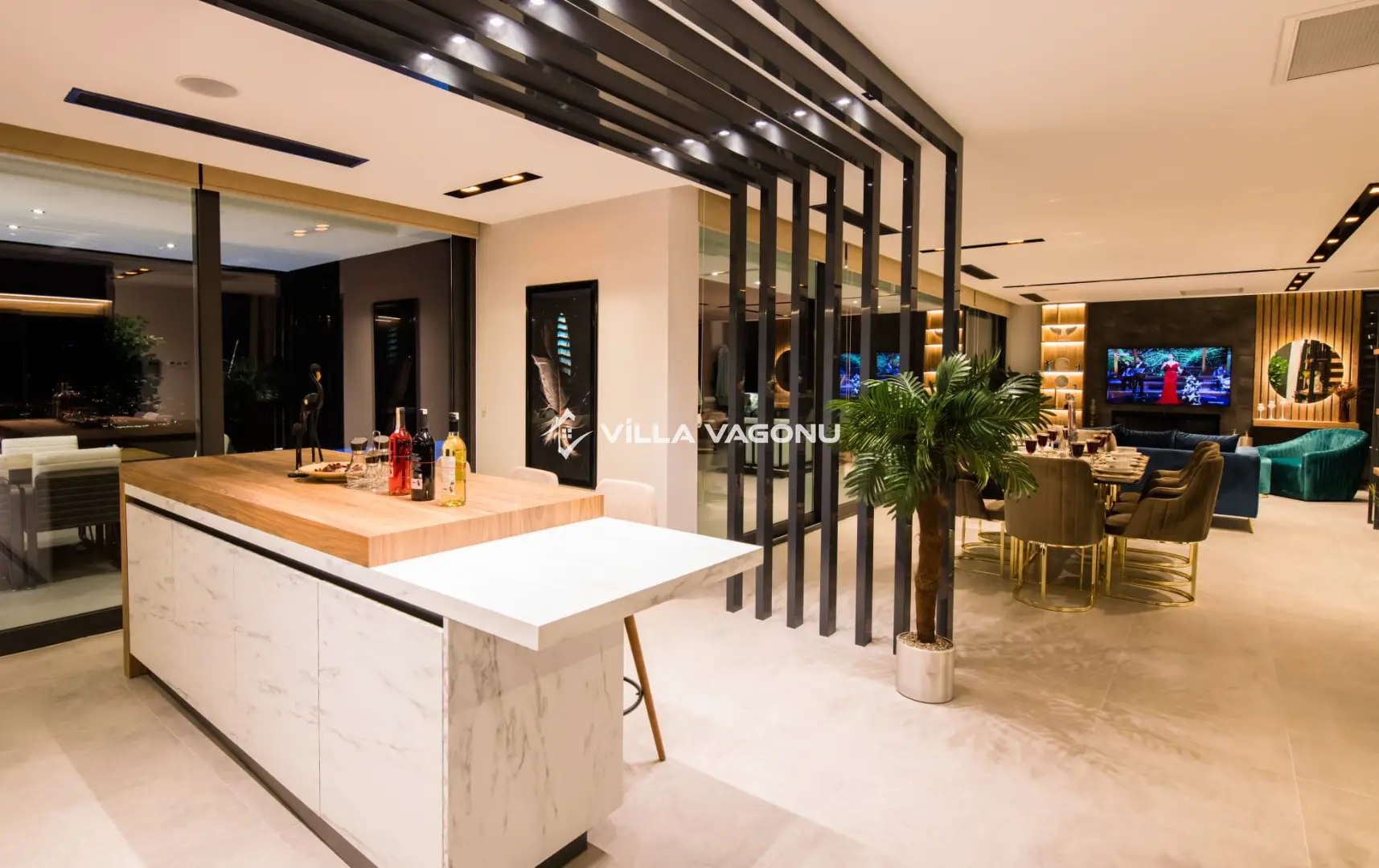 Villamızın özel havuzunda doyasıya yüzebilir ve güneşin keyfini çıkarabilirsiniz. Bahçe alanında kapasiteye uygun şezlong takımı, oturma grubu ve barbekü bulunmaktadır. Havuz terasına açılan konforlu oturma odası ve tam donanımlı açık mutfak, tatilinizi daha da keyifli hale getirecek. Villamızın birinci yatak odasında çift kişilik yatak, ebeveyn banyosu ve jakuzi; ikinci yatak odasında bir adet tek çift yatak ve banyo; üçüncü yatak odasında iki adet tek kişilik yatak ve banyo; dördüncü yatak odasında ise iki adet tek kişilik yatak ve banyo yer almaktadır. Aynı zamanda lüx villamızın içersisinde keyifli bir zaman geçirebilmeniz için kapalı havuzu ve bilardo masası, bar,sauna ve spor salonu bulunmaktadır.